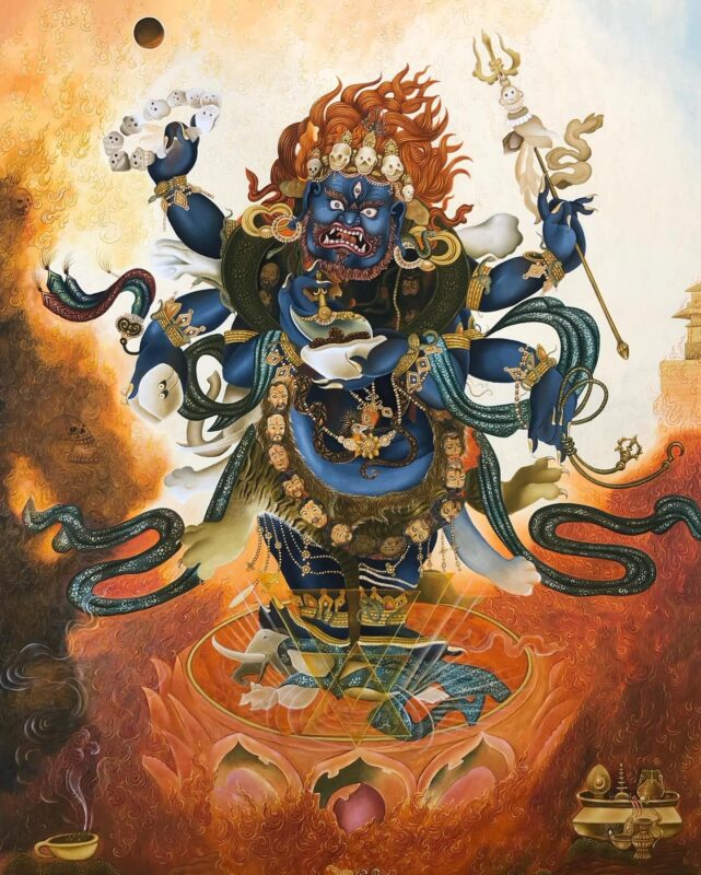 Color, Texture, and Painterly Conventions: Tibetan painters consistently use deep blue-black for Mahākāla’s skin. They describe it as a tone that absorbs negativity without letting it scatter. The flames around his body are usually layered in three colors to mark increasing heat, a detail maintained across regions. The ground beneath him sometimes includes small offerings or fragments of ritual space. These visual elements help align the deity with the ritual room, creating a space where the practitioner feels accompanied rather than overwhelmed.